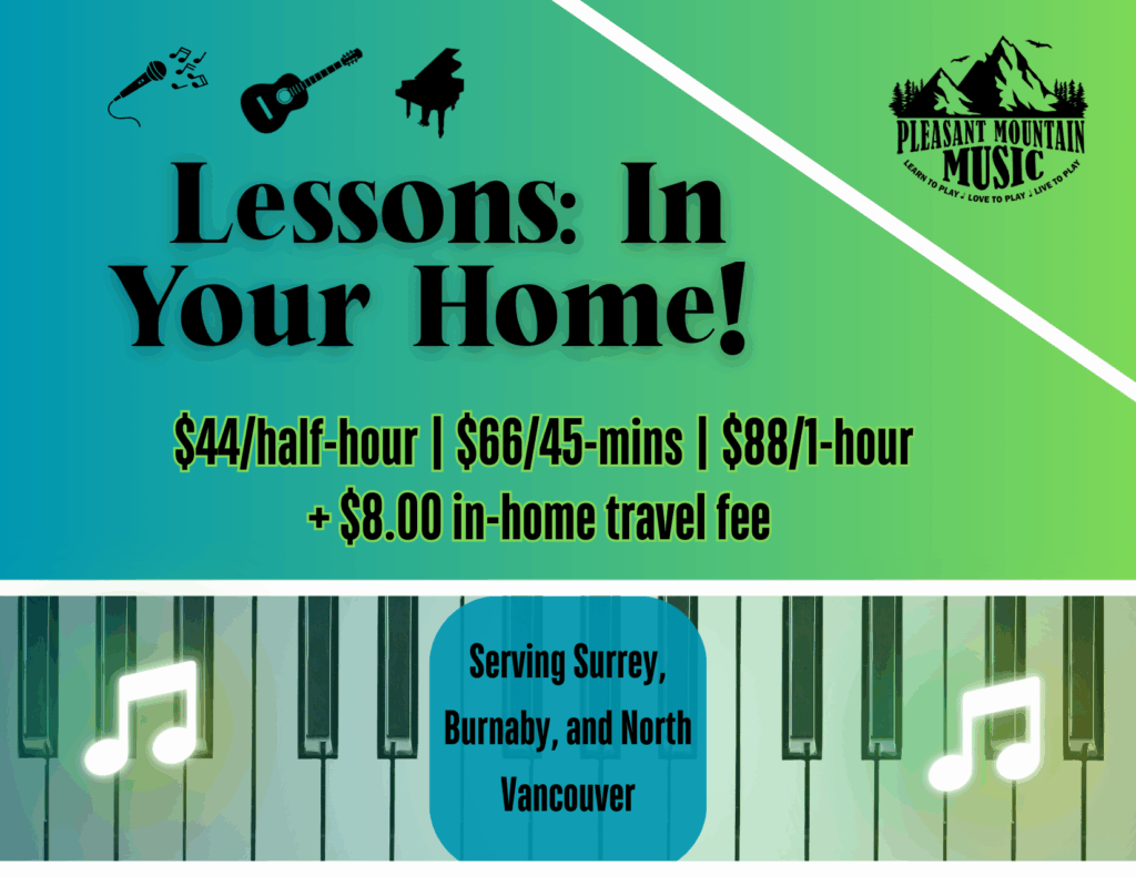 Pleasant Mountain Music is delighted to offer in-home lessons in the Greater Vancouver Region. Having our instructors come to your home is a super convenient way to ensure you or your kids get their music education, while cutting down on your own personal travel time for activities through the week. All in-home lesson students are still invited to the annual recitals (December & June) and will receive updates and event listings through our Newsletter, if you opt-in!